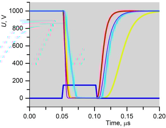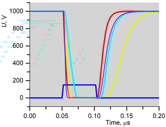 There are many ways to improve the quality of HV equalization (balancing) on series-connected transistors of the same type. The combination of advantages and limitations of particular techniques is analyzed in a number of reviews [1,2,3,4,5,15]. For instance, in the large-scale production of HV pulse generators [18,19], specialized companies may employ pre-selected transistors that are not exactly identical but vary only slightly in terms of parameters. However, this approach to voltage equalization requires a large number of transistors for per-selection. This is one of the current methods for solving the voltage equalization problem.