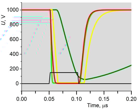 Figure 6 and Figure 7 demonstrate that the switching of the selected HV transistors do not differ significantly in terms of rise and fall times, as well as turn-on (and turn-off) delay times. According to the simulation (Figure 8), the slew rate of STP4N150 at turn-on is approximately equal to the same value for the SCT1000N170 transistor; the G2R1000MT33J is a better choice, while the HV IXTT1N450HV ([13]) transistor (Umax = 4.5 kV) shows a noticeably lower switching speed (it can be suitable for an operation at the microsecond scale).