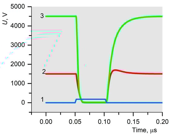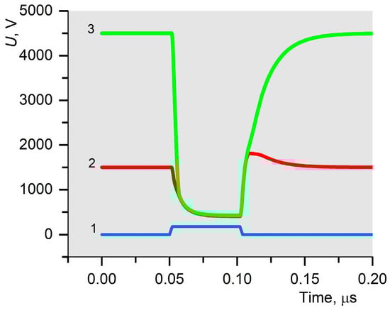 Let us consider the case of 2×MOSFET stack in which the T2 transistor is in ON stationary state while T1 with Umax = 1.5 kV is still in OFF state. The voltage overload on transistor T1 is shown in Figure 4. This overload is 2.25 kV − 1.5 kV = 0.75 kV but not 3 kV − 1.5 kV = 1.5 kV, as it would be in a conventional generator.