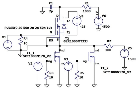 The GeneSiC [12] offers encrypted models of transistors that are only suitable for LTspice/PLECS programs, while the new and growing Qspice program [14] currently contains cascode models and only a few other HV transistors in its library. The selected transistors have the following characteristics: STP4N150, which is the low-cost and high-switching-speed transistor: Umax = 1.5 kV, pulsed drain current 12 A; SCT1000N170: Umax = 1.7 kV, pulsed drain current 20 A; and G2R1000MT33J: Umax = 3.3 kV, pulsed drain current 10 A.
