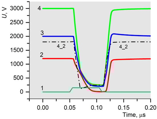 Voltage balancing on series-connected transistors of different types in the new generator. 1 (thin dark green): Pulses on gates of all transistors (10×); 2 (red): the voltage waveform for the drain of UF3C170400K3S cascode transistor at the T1 site; 3 (blue): the voltage waveform for the drain of STP4N150 at the T2 site; 4 (bold light green): the voltage waveform for the drain of STP4N150 at the T3 site (green). The 4_2 sign (black, dash-dotted) denotes the difference between T3 and T1 voltage waveforms (Qspice simulations).