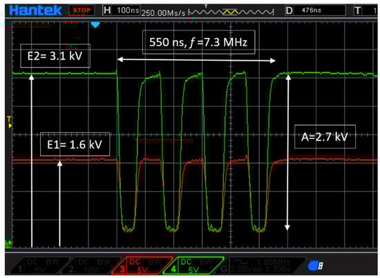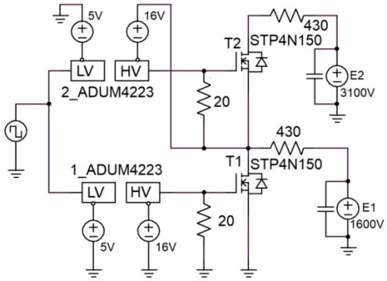 Figure 14 shows voltage waveforms for the generator with 2×STP4N150, where pulses are initiated by two ADUM4223 drivers. In the OFF state of both STP4N150 transistors, it was possible to set supply voltages that are slightly (50–100 V) higher than their Umax. In other words, during the switching processes, the voltage on the 2×STP4N150 was slightly higher than the maximum allowable voltage for the stack (extremely challenging transient test). Modeling in Micro-Cap 12 confirmed the experimental data obtained. The model of the new generator in the OFF state used E1 = 1600 V and E2 = 3100 V on the T1 and T2 transistors, respectively.