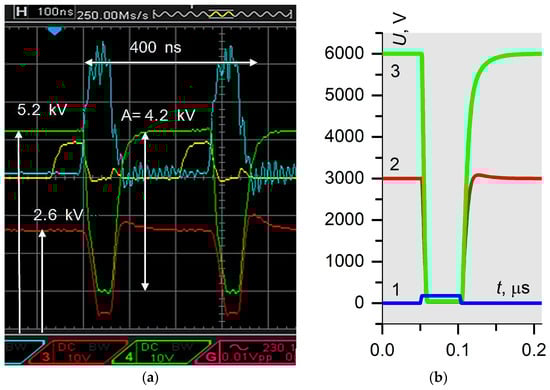 Verification of operational efficiency of new generators. (a) Experimental voltage waveforms on the drains of G2R1000MT33J transistors in two cascade stacks of new generators (the circuit as in Figure 13 with R1 and R2 loads of 860 Ω). Scales are 1 kV/div and 100 ns/div. HV probes are 1:100. Red waveform: the voltage on the transistor drain at the T1 site. Green waveform: the voltage on the transistor drain at the T2 site. Yellow waveform: the input signal for both ADUM4223 drivers. Cyan waveform: the voltage on the output of 1_ADUM4223 driver. (b) Simulated voltage waveforms on the drains of G2R1000MT33J transistors in two cascade stacks with two paralleled transistors at the T1 site (the circuit as in Figure 11 with loads R1 = 200 Ω and R2 = 1 k Ω). Scales are 1000 V/div and 100 ns/div. 1: pulses on gates of two paralleled transistors at the T1 site (blue, 10× magnification); 2: the waveform for the combined drain of two G2R1000MT33J transistors at the T1 site (red); 3: the waveform for the drain of G2R1000MT33J at the T2 site (green).