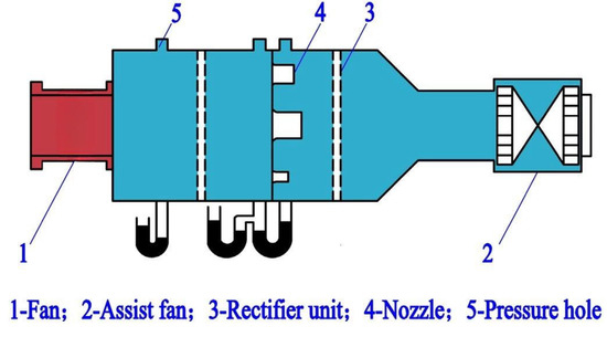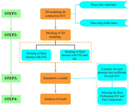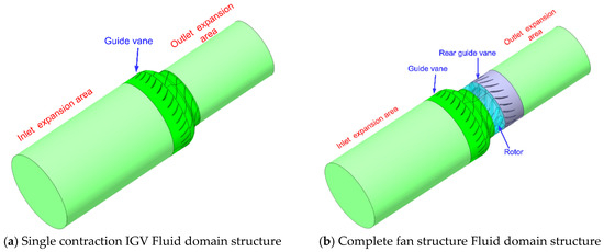 - Xiao, G.; Sai, Q.; Liu, Y. Study on the effect of accelerated IGV on the performance of highly loaded axial fans. J. Chongqing Technol. Bus. Univ. (Nat. Sci. Ed.) 2024, 41, 42–49. [Google Scholar]