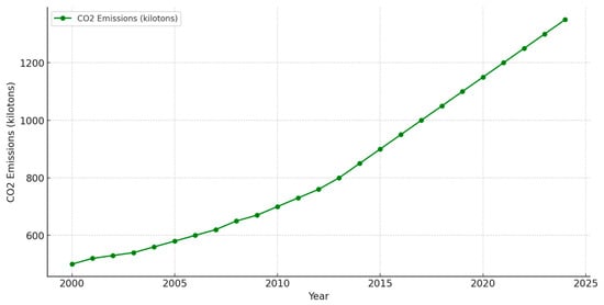 Water treatment plants (WTPs) play a key role in the municipal sector, but their operation involves significant environmental impacts, particularly in terms of carbon dioxide (CO2) emissions [18]. The sources of emissions are mainly energy processes, as SUWs consume significant amounts of electricity and most energy in many countries comes from fossil fuels [19]. Between 2000 and 2024, CO2 emissions associated with WTP operations increased from about 500 kilotonnes per year to 1350 kilotonnes, an increase of 170% (Figure 4). The rate of emissions growth accelerated significantly after 2010, due to the increasing energy intensity of technological processes and the increase in water demand [20,21].