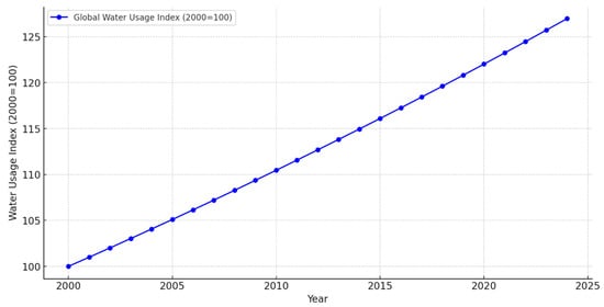 Figure 5 shows an index of global water consumption, based on data from the year 2000, when the consumption value was taken as 100 units. An annual increase of 1% has been taken into account to estimate water consumption in subsequent years. In 2024, global water consumption increased to approximately 126 units, indicating a 26% increase compared to the base year. The data were based on UNESCO [6] reports and the scientific literature, which indicate a stable annual increase in water consumption of 1% [4,34,50]. Extrapolation was made assuming a constant growth rate, taking into account the impact of factors such as population growth, urbanisation, and industrial development. The values of the graph are indexed, allowing for easy comparison of global trends [57].