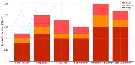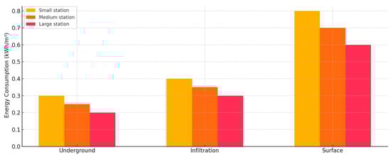 Figure 6 compares the energy consumption of water treatment plants (WTPs) by type and size of water treated: groundwater, infiltration, and surface water. The energy consumption values presented in this study for different types of water treatment plants (groundwater, infiltration, and surface water) are based on an extensive review of the scientific literature and sector reports, ensuring their consistency with established data. Multiple studies have confirmed that energy consumption in WTPs varies depending on the water source, plant scale, and applied treatment technologies (e.g., [21,31,58,68]).