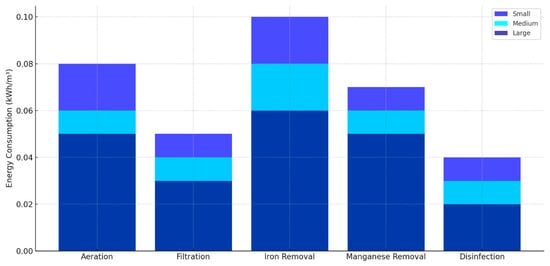 Figure 7 shows the energy consumption per unit of water for the technical processes typical of groundwater treatment plants: aeration, filtration, removal of iron and manganese, and disinfection. Groundwater is characterised by relatively simple treatment processes, which is reflected in the chart’s energy consumption results. Aeration is the most energy-intensive stage and, in small stations, it reaches 0.08 kWh/m3, due to the limited efficiency of simpler aeration equipment. In large stations, aeration consumes 0.05 kWh/m3, a result of more advanced pressure aerators and better airflow management. Filtration, crucial for the removal of mechanical particles, is a moderately energy-intensive process, with consumption ranging from 0.05 kWh/m3 in small stations to 0.03 kWh/m3 in large stations. This decrease is due to the use of advanced filtration techniques in larger units. The process of iron removal from the water, a key step in groundwater treatment plants, consumes 0.1 kWh/m3 in small plants and 0.06 kWh/m3 in large plants, due to the use of more efficient iron precipitation methods. Similarly, the removal of manganese shows a high energy intensity, especially in small stations, where it is 0.07 kWh/m3, while, in large facilities, it is reduced to 0.05 kWh/m3. The disinfection process, due to its simplicity and lower energy requirements, is the least energy-intensive [32,34]. In small stations, the consumption is 0.04 kWh/m3, while, in large ones, it drops to 0.02 kWh/m3.