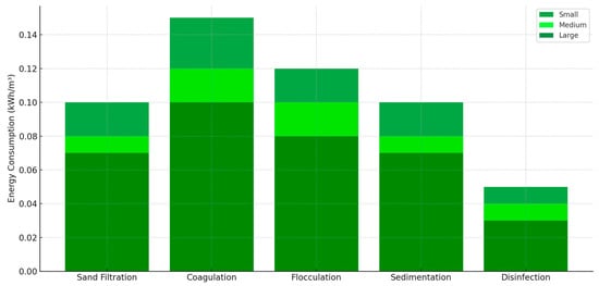 Figure 8 shows the energy demand of the processes used in infiltration water treatment plants: sand filtration, coagulation, flocculation, sedimentation, and disinfection. In the case of infiltration water, processes such as sand filtration, coagulation, flocculation, sedimentation and disinfection have a higher energy demand than groundwater due to more complex technologies [21,57,60]. Sand filtration in small stations consumes 0.1 kWh/m3, while in large stations it drops to 0.07 kWh/m3, due to the use of systems with high hydraulic efficiency. Coagulation is the most energy-intensive process, with consumption in small stations reaching 0.15 kWh/m3, which can be attributed to the need for intensive mixing and the use of large quantities of chemicals. At large stations, consumption in the coagulation process is 0.1 kWh/m3 due to optimised chemical dosage and modern agitators. Flocculation, which is the connecting step between coagulation and sedimentation, also shows high energy consumption in small stations of 0.12 kWh/m3, falling to 0.08 kWh/m3 in large stations. Sedimentation, a key process in the removal of larger particles, has an energy consumption of 0.1 kWh/m3 in small stations and 0.07 kWh/m3 in large stations. Disinfection in stations serving infiltration water is a moderately energy-intensive process, consuming between 0.05 kWh/m3 in small stations and 0.03 kWh/m3 in large stations.