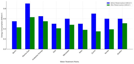 The characteristics of the applied technological processes are a key factor influencing the energy consumption of the WTP. Processes such as coagulation, flocculation, membrane filtration, and advanced disinfection methods are more energy-intensive than standard technologies such as sand filtration or chlorination [22,23,24]. For example, membrane filtration consumes between 0.2 and 0.6 kWh/m3, depending on the type of membranes and operating pressure, which is a significantly higher energy cost compared to sand filtration (0.08–0.12 kWh/m3). In addition, coagulation and flocculation processes require intensive mixing, which can increase the energy requirement to 0.15–0.2 kWh/m3 for infiltration and surface water [60].
