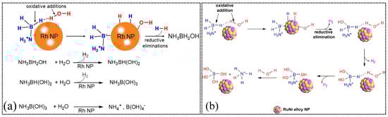 - Rachiero, G.P.; Demirci, U.B.; Miele, P. Bimetallic RuCo and RuCu Catalysts Supported on γ-Al2O3. A Comparative Study of Their Activity in Hydrolysis of Ammonia-Borane. Int. J. Hydrogen Energy 2011, 36, 7051–7065. [Google Scholar] [CrossRef]