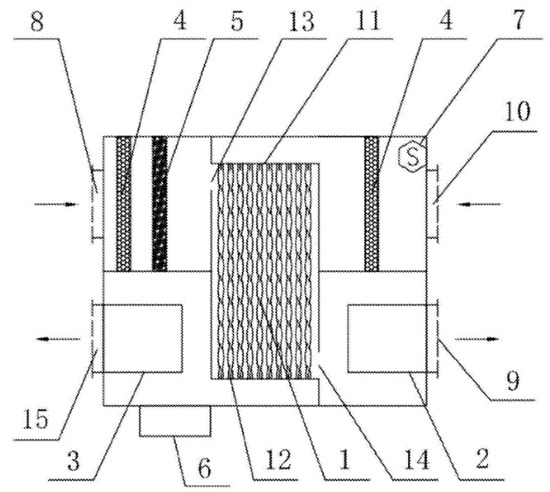 Principle Diagram of Fresh Air Products with Wall-Type Energy Recovery Function. 1 heat recovery device; 2 fresh air fan; 3 exhaust fan; 4 coarse-effect filter; 5 air purification device; 6 control module; 7 CO2 sensor; 8 fresh air inlet; 9 fresh air outlet; 10 exhaust air inlet; 11 filtered exhaust inlet; 12; exhaust outlet after energy release; 13 purified fresh air intake; 14 fresh air outlet after energy recovery; 15 exhaust outlet.