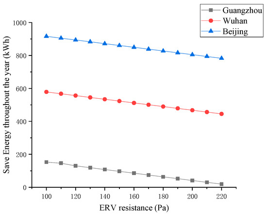 As demonstrated in Figure 2, an increase in the fan power consumption required to overcome ERV resistance correlates with a decrease in ERV energy-saving gains across the three typical cities studied. The impact of ERV resistance on annual energy savings is the most pronounced in Guangzhou, where the energy-saving gains are relatively smaller. Specifically, when ERV resistance rises from 100 Pa to 220 Pa, the reduction in annual energy-saving gains from ERVs in the three cities is as follows: 87.75% in Guangzhou, 23.06% in Wuhan, and 14.57% in Beijing.