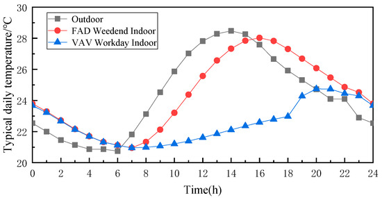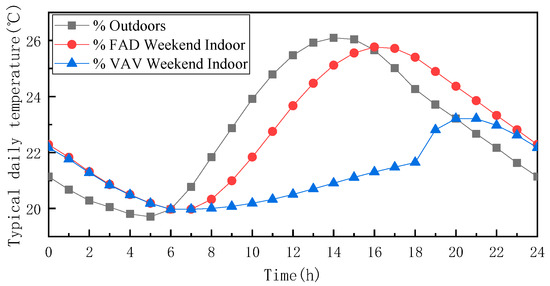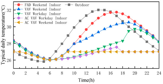 The 24-h variation trend in indoor average temperature on typical days in spring in Guangzhou under time-phased control mode. (VAV: Variable Air Volume. FAD: Full Airflow Delivery.).