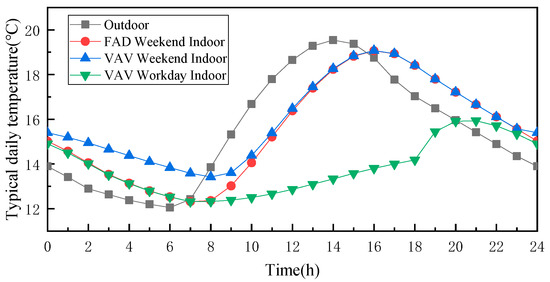 The 24-h variation in typical daily indoor average temperature in Guangzhou during winter under time-phased control mode. (FAD: Full Airflow Delivery. VAV: Variable Air Volume.).