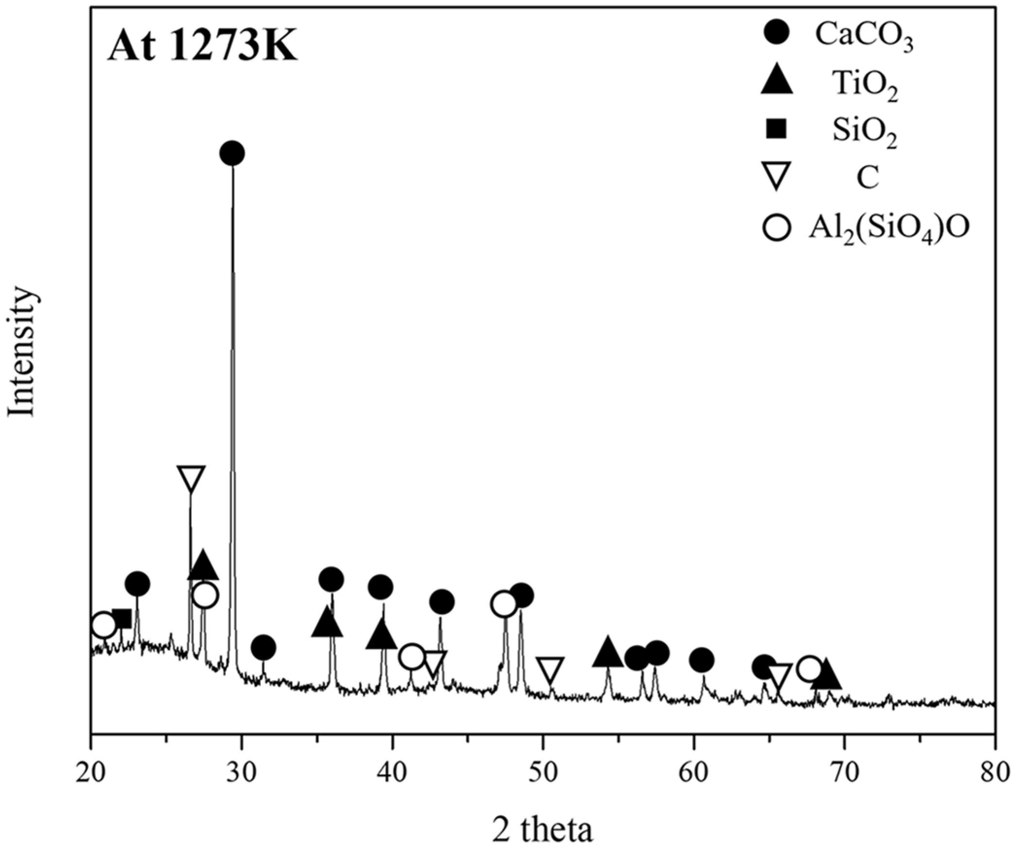 Table 5 and Figure 5 show the composition and phase analysis of the ash obtained by heating the pyrochar at 1273 K for 6 h, using XRF and XRD, respectively. The ash in the pyrochar had high CaO and Al2O3 contents and a low SiO2 content. An XRD analysis revealed that the CaO in the ash did not form a slag phase and rather formed CaCO3. In ferrous metallurgy, the slag basicity of CaO/SiO2 is an important factor for the reduction of iron oxide [21]. Slag basicity is generally controlled by adding free CaO obtained from CaCO3. Therefore, pyrochar can be considered a carbonaceous resource with significantly low volatile matter and moisture contents and a high ash content (including a high CaO content).