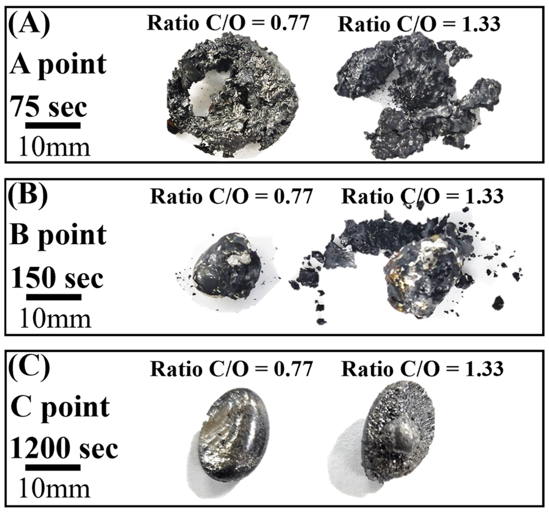 Photographs of the reduced sample after reaction at 1823 K (A) A point, (B) B point, and (C) C point.