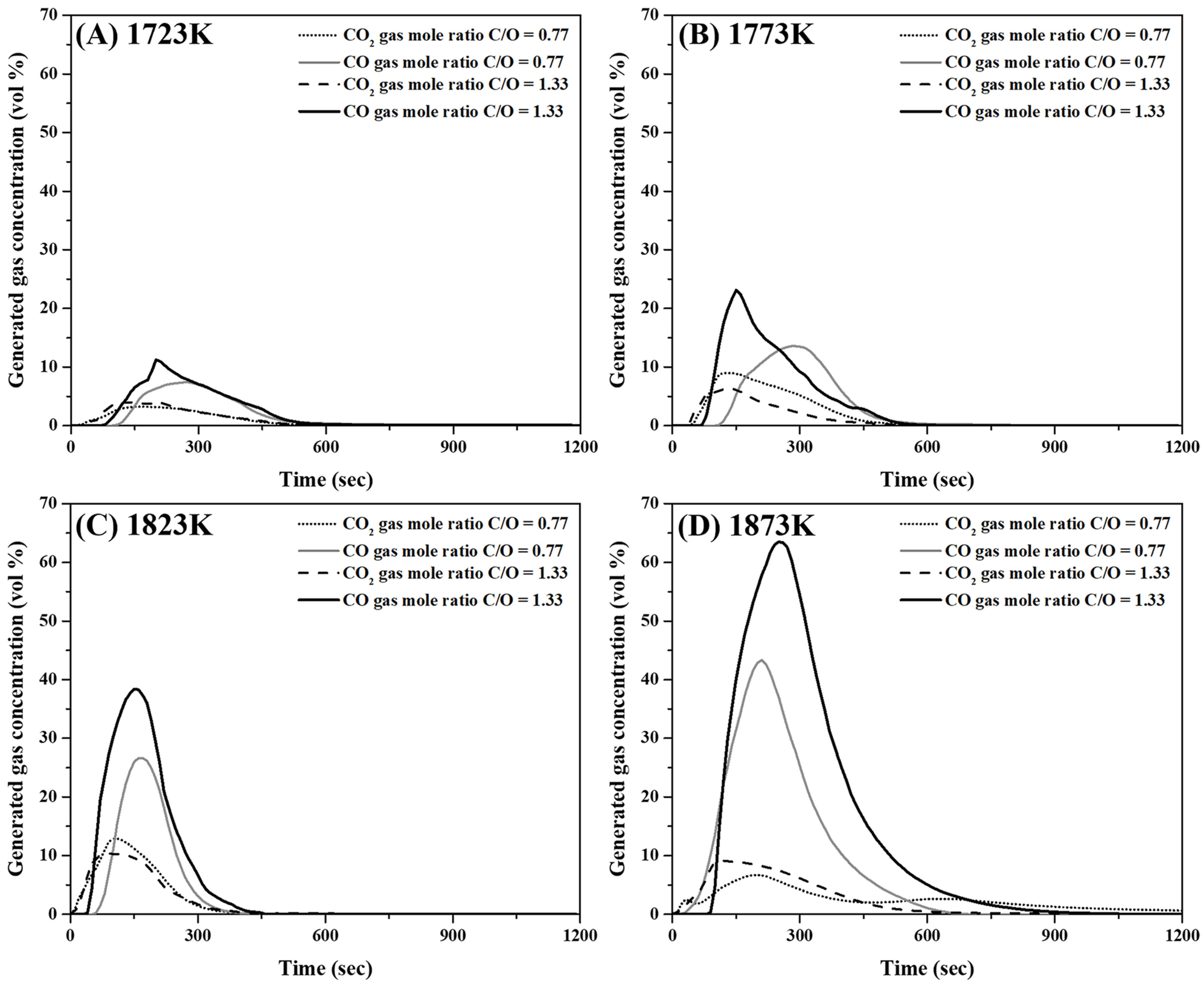 Figure 9A–D show the concentration variations of CO and CO2 in the released gas at 1723 K, 1773 K, 1823 K, and 1873 K, respectively. As shown in Figure 9, the variation in CO2 concentration between the two mixtures with different molar ratios was not significant. Moreover, the maximum CO gas generation increased with an increase in the C/O ratio and temperature.