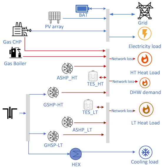 The general layout of the hybrid renewable energy system (HRES) is shown in Figure 2. In the current system, the electricity demand is only provided by the grid, and heating demand is served by a natural gas boiler operating at 70 °C. The cooling demand is met by an electrical chiller. In the optimal energy system to be designed, PV panels (for power), a natural-gas fired CHP (for power and high-temperature heat), as well as air-sourced heat pumps and geothermal heat pumps (for low-temperature heat) are considered as available options. The HRES is connected to the electricity grid, enabling both energy import and export. All buildings are linked to a decentralized heating network. Further details are provided in Section 2.5.