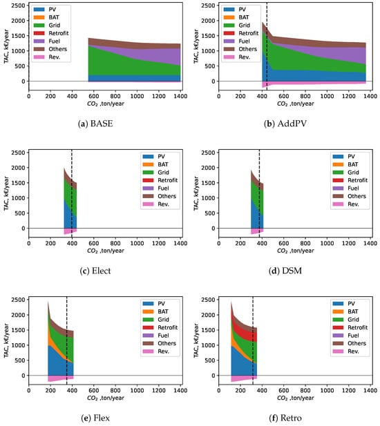 The TAC is calculated as the total costs of the energy system, excluding the revenue. It includes capital expenditures (CAPEXs), operational expenditures (OPEX), tax (), gas costs (), electricity costs (), and revenue from electricity feed-in (). Mathematically, the TAC can be expressed as: