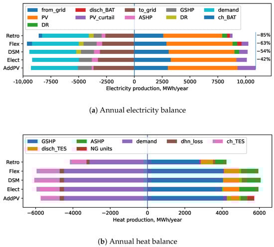 For the scenario AddPV with PED requirement, monthly renewable electricity production, and electricity consumption, see Figure A2.