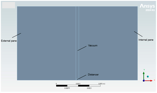 The numerical simulations of the repeating element in the glazing away from the edge seal have been performed in the Ansys Fluent 2024 R1 program. The program uses the finite volume method to solve the heat transfer steady-state derivative equations. The part of the analyzed geometry (Model 1) is given in Figure 2. The second analyzed model differs only in the absence of the distancer (Model 2).