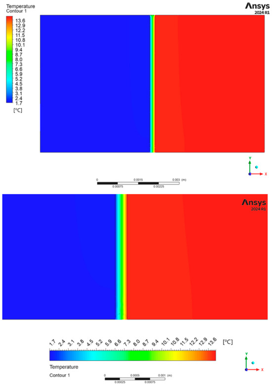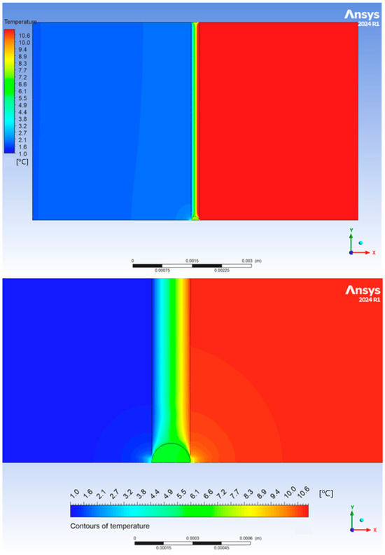 Model 2—contours of temperature in the VIG glazing without the distancer; (upper figure)—the whole model; (lower figure)—the lower part of the model without the distancer.