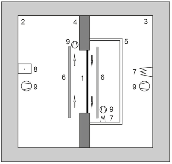 Scheme of the calorimetric chamber: 1—tested specimen, 2—cold chamber, 3—warm chamber, 4—surrounding panel, 5—hot box, 6—baffle, 7—heating unit, 8—cooling unit, 9—fan.