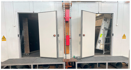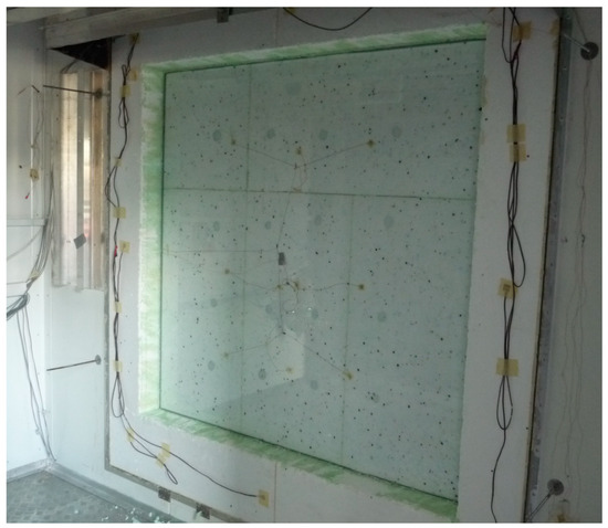 Two calibration panels had total thicknesses of 28 mm and 68 mm and were built of polystyrene covered on both sides with 4 mm glass. The panels had the dimensions of 1100 mm × 1100 mm. Both of them were mounted on the surrounding panel with a reveal depth of 40 mm on the warm side according to the EN ISO 12567-1 standard. Figure 9 presents the view of one of the calibration plates mounted on the surrounding panel in the calorimetric chamber. Each of the calibration panels was tested under three conditions: internal (warm) temperature of 20 °C and external (cold) temperature of 0 °C, −10 °C and 10 °C with the fan settings fixed. The results of the calibration measurements are given in Table 4.