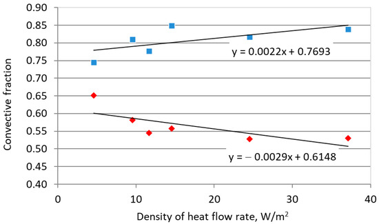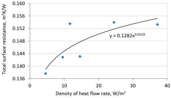 The measurements let us sketch the regression curves using the least-squares method: surround panel thermal resistance in terms of its average temperature (Figure 10), as well as total surface resistance and convective fraction in terms of density of heat flow rate (Figure 11 and Figure 12, respectively).