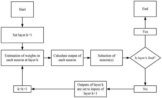 In Equation (2), y represents the consumed electric energy , is the prediction vector, and represents the coefficient [14,44]. The input layer contains neurons corresponding to each input variable, denoted as x. Each first-layer neuron receives inputs from two input-layer neurons. Two neurons in layer one, the preceding layer, provide inputs to neurons in layers two and three, a cycle that continues until the output layer. The final result, which represents the optimal equation to satisfy the association of the input and output variables, is produced by taking two of the inputs to the output layer from the previous layer. The basic sequence of GMDH and GMDH network are shown in Figure 3 and Figure 4, respectively [45].