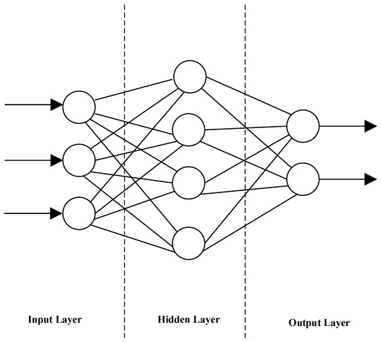 An artificial neuron is the most fundamental unit of an ANN, capable of processing complex patterns of behavior through the interactions between neurons and their associated weight parameters [46]. The input layer, hidden layer, and output layer are the primary sorts of neuron layers that make up a feedforward MLP architecture, that is commonly used for modeling an ANN. The input layer is where the external data are processed, while the hidden layers employ weighted connections and activation functions that allow the network to capture complex patterns. The final stage involves the output layer producing the results or predictions, thereby finalizing the cycle of information processing through the network. A simple single-hidden-layer feedforward ANN topology is depicted in Figure 5.