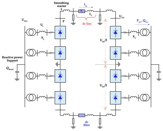 LCC converters are classified as current source converters. The LCC converters utilise unidirectional DC current flow to maintain a constant output current value. Until a second zero-crossing current occurs, thyristor switches employed in the converter tend to uphold the same condition []. The switching frequencies of these converters align with the line frequencies and, therefore, lack black start ability. Due to the lack of frequencies in complete blackout scenarios, the black starting is unfeasible. The converter depends on the thyristor operations, hence depending on the switching voltage, which affects the functionality during a blackout. LCC-based technology is predominant in many existing projects. The single line diagram of an LCC HVDC topology is shown in Figure 1. However, there is a shift in focus towards VSC converters, as they provide independent control over reactive power [,].