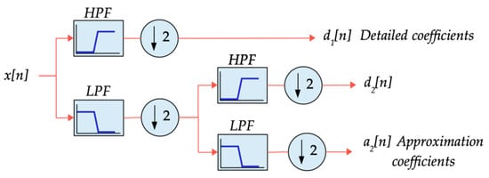 DWT employs the Mallat algorithm to filter the signal. This filtering process yields approximations and detailed coefficients as specified in Equations (4) and (5). The approximation coefficients represent high-scale, low-frequency components, while the detail coefficients represent low-scale, high-frequency components when subjected to low-pass and high-pass filters, respectively [,,].