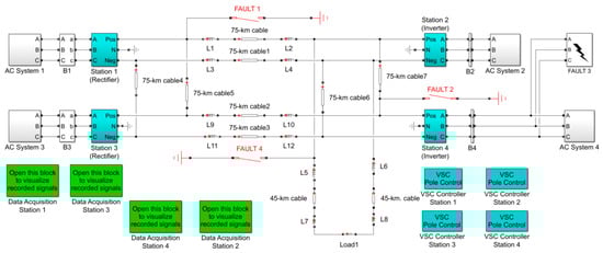 Two internal DC faults near rectifier 1 (F1) and terminal 4 (F2) and an external AC fault near inverter station 4 (F3) and an external DC fault on a 45 km DC line (F4) were introduced. Fault inception time was 0.3 s, and the fault duration was 0.1 s. Both faults had 0 Ω (negligible) as fault resistance.