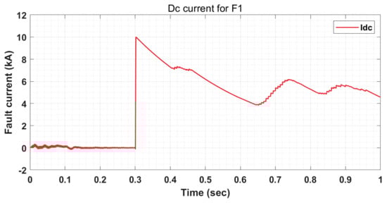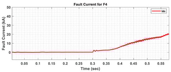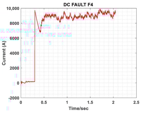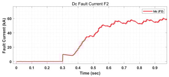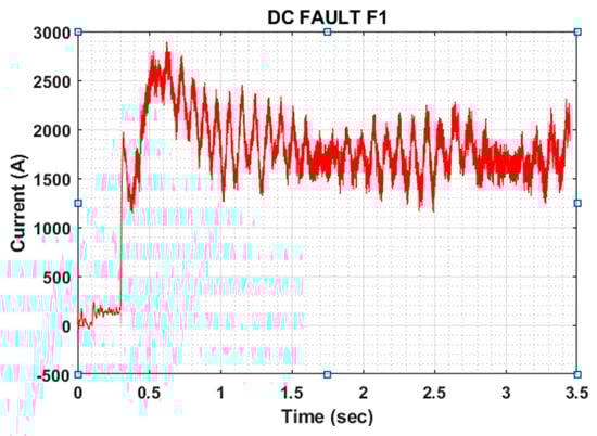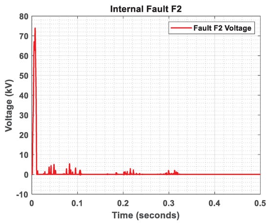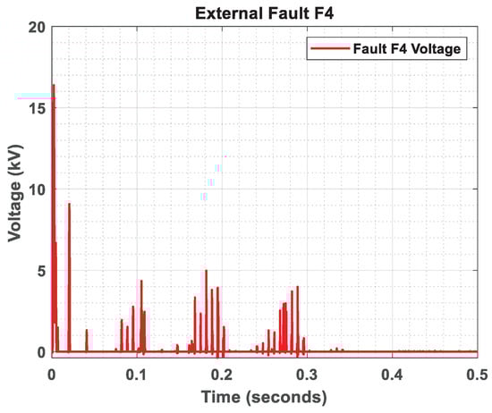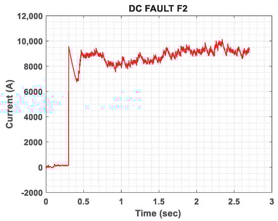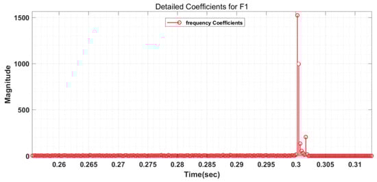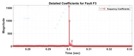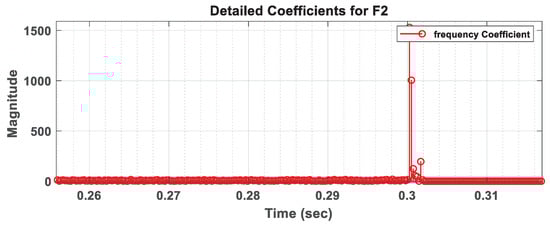 For F2, the current signal, as shown in Figure 9, surges up to 10 kA, but in this case, it increases by a greater degree. Figure 10 demonstrates the voltage signal at the fault inception point, which displays similar behaviour to fault F1 as it plummets towards zero. A low inductive reactance at lower frequencies in a DC line cannot prevent the DC voltage from collapsing near the faulted end, as the stored energy of the line and smoothing reactor discharges into the fault []. The obtained signals are influenced by harmonic distortions. At 0.3 s, which marks the fault inception time, the detail coefficients exhibit higher values, as shown in Figure 11, indicating the presence of high-frequency components in the signal. At the decomposition level focusing on these high-frequency bands, the wavelet algorithm naturally produces large coefficient magnitudes as the system tries to redistribute current instantaneously. The absolute coefficients within the time series exceed the set relay threshold, identifying the fault as an internal fault.