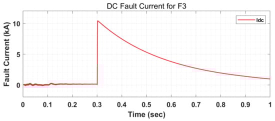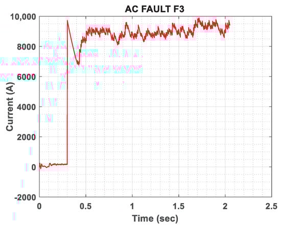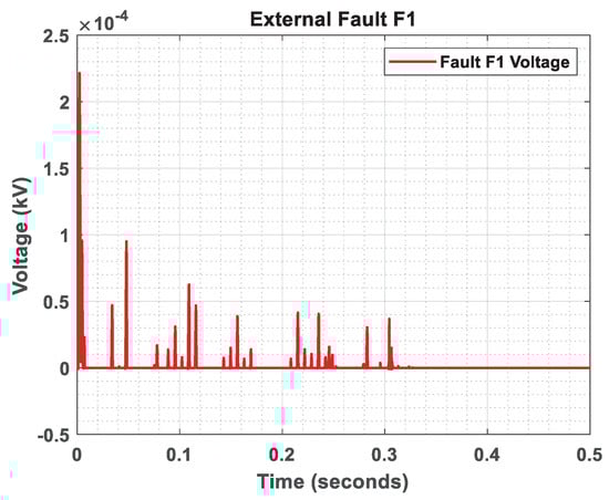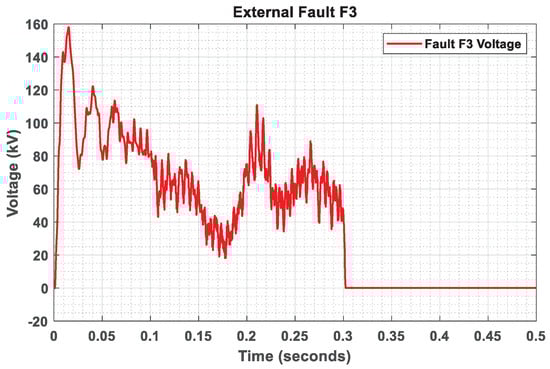 Under no-fault conditions the wavelet coefficients remain zero as observed in Figure 12 and Figure 13. The wavelet transform theory is still validated as the system responds to the transients in the signal. The fault current value is slightly higher, as seen in Figure 14 and Figure 15, due to the reduced distance from the relay point, causing it to nearly overlap with the internal fault value. The voltage signals for both faults, as seen in Figure 16 and Figure 17, show a similar decrease in voltage as observed in internal DC faults. This DC link voltage drop for fault F3 is because the converter cannot sustain the DC output when the AC input is faulted. However, the algorithm successfully classifies the fault by using the detail coefficient, which in the case of an external fault is lower than that of previous internal faults.
