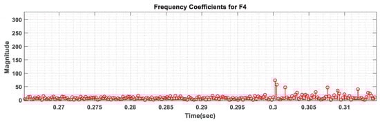 For F1, the current magnitude peaks at the fault inception time of 0.3 and continues to grow because of a low impedance path at the fault pole. For simplicity, only DC positive pole current and voltages are considered. Figure 6 and Figure 7 show the DC fault current and voltage at the inception of internal fault F1, respectively. At the onset of the fault, the positive pole current peaks at approximately 10 kA and fluctuates between 5 kA and 2.8 kA, significantly higher than the initial current values in the absence of a fault. In contrast, the voltage quickly drops to 0 as soon as the fault occurs at 0.3 s. Coefficient values, as shown in Figure 8, remain at zero until the fault time, after which they increase relatively sharply around 0.30026 s. These non-zero coefficients signify abrupt changes in frequency when a fault occurs. Therefore, wavelet transforms detect high-frequency components during transient stages before they manifest into surges. Both current and voltage signals react simultaneously to the fault arrival time, with the non-zero coefficients returning to zero thereafter.