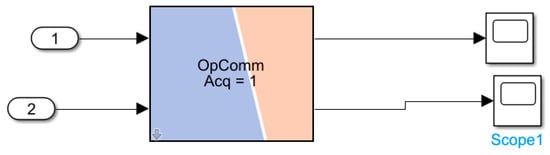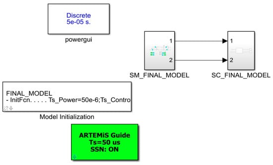 The Simulink model, as shown in Figure 5, was designed for real-time execution using the OPAL-RT simulator. The significant components within the system include the OPComm block, as shown in Figure 18, which enables communication between the Simulink model and OPAL-RT. For precise real-time simulations, the ARTEMIS Guide block, as seen in Figure 19, synchronises the solver with the time step of 50 μs. SM_FINAL_MODEL is a subsystem with four terminal grids injected for analysis. SC_FINAL_MODEL is a logic that analyses signals and establishes fault situations.