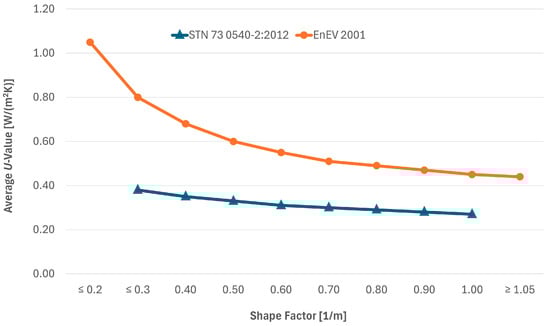 The idea of associating the operational energy rating of buildings with their geometry (A/V) dates back to the 1980s [17,18,19,20], with attempts to limit it fairly in the sense that more compact buildings could afford higher heat losses than less compact buildings while still being classified within the same category. Initially, the focus was on the average U-value of the building envelope in relation to the building geometry; however, later, it was the heat demand for heating and, finally, the primary energy demand for building operation. The latter method of assessment only came about in the second decade of this century. The chart in Figure 1 illustrates the correlation between the average U-value of the building envelope (residential buildings) and the shape factor in accordance with the requirements of the Slovak STN 73 0540 of 2012 [22] and the German EnEV 2001 (in German standard and legislation the average U-value of the building envelope is described as HT’—Spezifischer Transmissionswärmeverlust (Specific Transmission Heat Loss), having the same unit as U-value) [23]. The German EnEV presents the U-values before and STN 73 0540 after their tightening due to the European Energy Performance of Buildings Directive 2010 [4]. It should be noted that the maximum and, hence, average U-values have also been lowered in Germany since 2010.