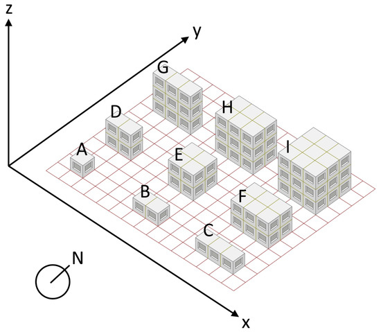 Figure 2 illustrates the geometric variants based on a cube of dimensions 3 m × 3 m × 3 m, which may be interpreted as a representation of a diminutive domestic dwelling (kind of tiny house). With the exception of variant A, all others are multiples of it in one, two, or all three axial directions. For each variant, the shape factor and the total PENRT and GWP values were calculated.