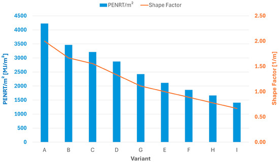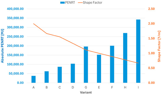 Comparison of high-mass envelope variants studied in terms of their shape factor, , and the PENRT value converted to 1 m2 of floor area of heated space. The shape factor (line) is linked to the secondary y-axis and the PENRT/m2 value to the primary y-axis.