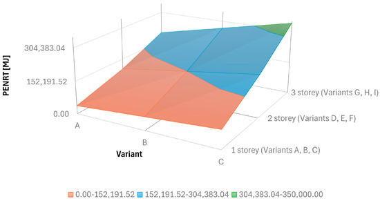 A comparison of the variants studied in terms of their shape factor, the PENRT/GWP absolute value of the high-mass building, and the PENRT/GWP value related to 1 m2 of the heated floor area is presented in Table 2. It shows that there is an inverse relationship between the shape factor and the absolute PENRT/GWP value, i.e., the lower the shape factor, the higher the absolute PENRT/GWP value (small buildings with fewer floors, i.e., higher shape factor, require less energy input in absolute terms than large buildings with a higher number of floors).