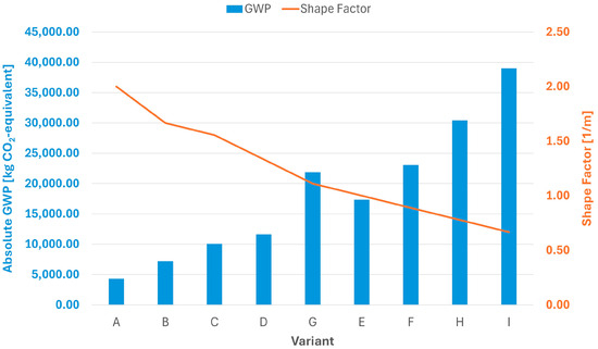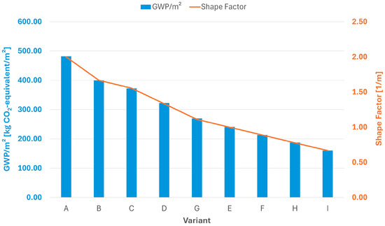 Comparison of high-mass envelope variants studied in terms of their shape factor, , and the GWP value converted to 1 m2 of floor area of heated space. The shape factor (line) is linked to the secondary y-axis and the GWP/m2 value to the primary y-axis.