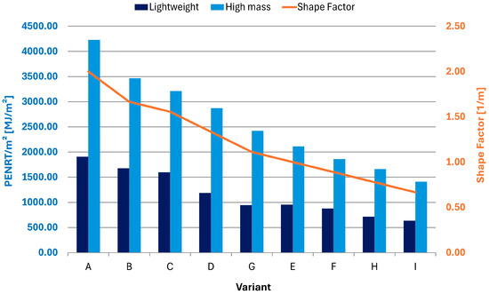 Comparison of high-mass and lightweight envelope variants studied in terms of their shape factor, , and the PENRT value converted to 1 m2 of floor area of heated space. The shape factor (line) is linked to the secondary y-axis and the PENRT/m2 value to the primary y-axis.