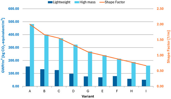 Comparison of high-mass and lightweight envelope variants studied in terms of their shape factor, , and the GWP value converted to 1 m2 of floor area of heated space. The shape factor (line) is linked to the secondary y-axis and the GWP/m2 value to the primary y-axis.