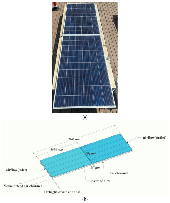 Two polycrystalline PV panels are positioned on an existing horizontal roof, as depicted in Figure 1a. The PV panels are covered on their left and right sides due to the presence of an air channel, creating an enclosed space underneath for cooling. Air enters through lower-level inlets and exits through upper-level outlets. The specifications of the solar PV panels are detailed in Table 1.