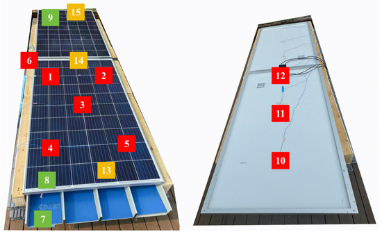 The experiments utilized thermocouples with an accuracy of ±0.5 °C, which were calibrated prior to experimentation. Thirteen thermocouples were attached to the PV panels’ front and back surfaces. Two anemometers were positioned at the inlet and outlet of the air channel to measure air velocity and temperature. Additionally, a solar irradiance monitor with an accuracy of ±5% was placed at the same level adjacent to the PV panels to measure solar radiation. The arrangement of all monitoring points is illustrated in Figure 2 and detailed in Table 2.