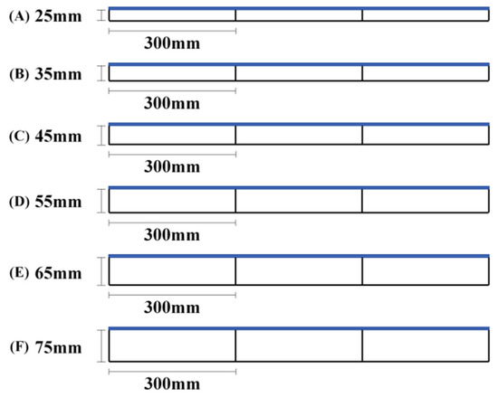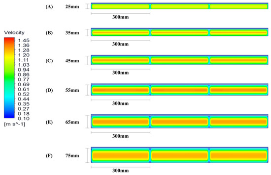 The geometry was created and developed using SpaceClaim. For each simulation, the height of the air channel was incrementally increased by 10 mm. Meanwhile, the width was maintained at a constant 300 mm, approximately one-third of the width of the PV panel. Thus, Figure 3 illustrates six different models with varying air channel heights: 25 mm, 35 mm, 45 mm, 55 mm, 65 mm, and 75 mm.