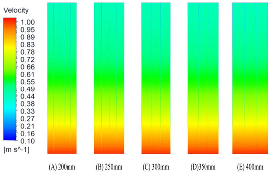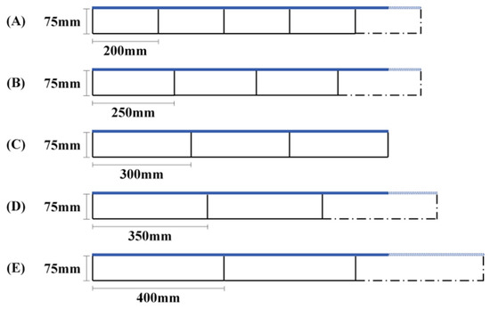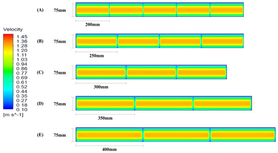 The optimal air channel height identified from the previous analysis was applied in a parametric study to determine the most advantageous air channel widths. Five models were proposed with air channel widths increasing by 50 mm increments, ranging from 200 mm to 400 mm, aimed at enhancing cooling performance, as shown in Figure 4. Due to the imperfect alignment between the air channel and PV panels in width, dashed lines were used to complete the alignment. Through trial calculations, it was found that the change in the size of the PV module, resulting from the modification of the flow channel, leads to a negligible change in the temperature of the PV module.